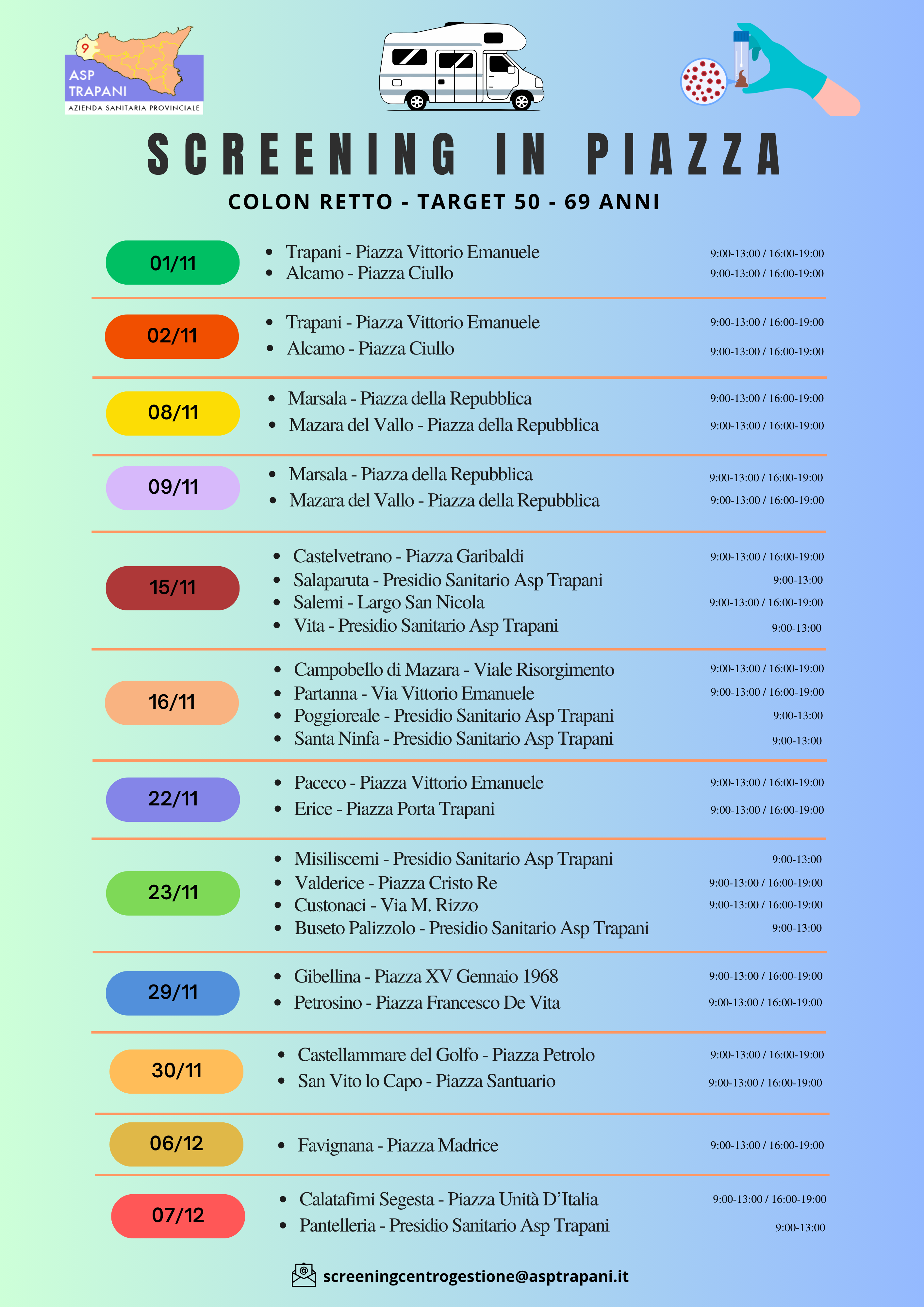 la prevenzione rappresenta uno degli strumenti fondamentali per la tutela della salute pubblica e per la diagnosi precoce delle patologie oncologiche, consentendo di individuare le malattie in fase inziale. In tale contesto i Sindaci dei Comuni della provincia di Trapani sono stati informati dell'iniziativa di prevenzione oncologica " Screening in Piazza", in allegato il calendario delle giornate di screening previste.